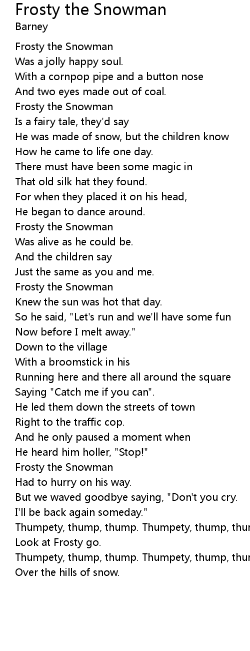 "Frosty the Snowman with lyrics", . This site is an open community for users to share their favorite pic on the internet, all picture or pictures in this site are for personal pic use only, it is stricly prohibited to use this pics for commercial purposes, if you are the creator and find this pics is shared without your permission, please kindly raise a DMCA report to Us.